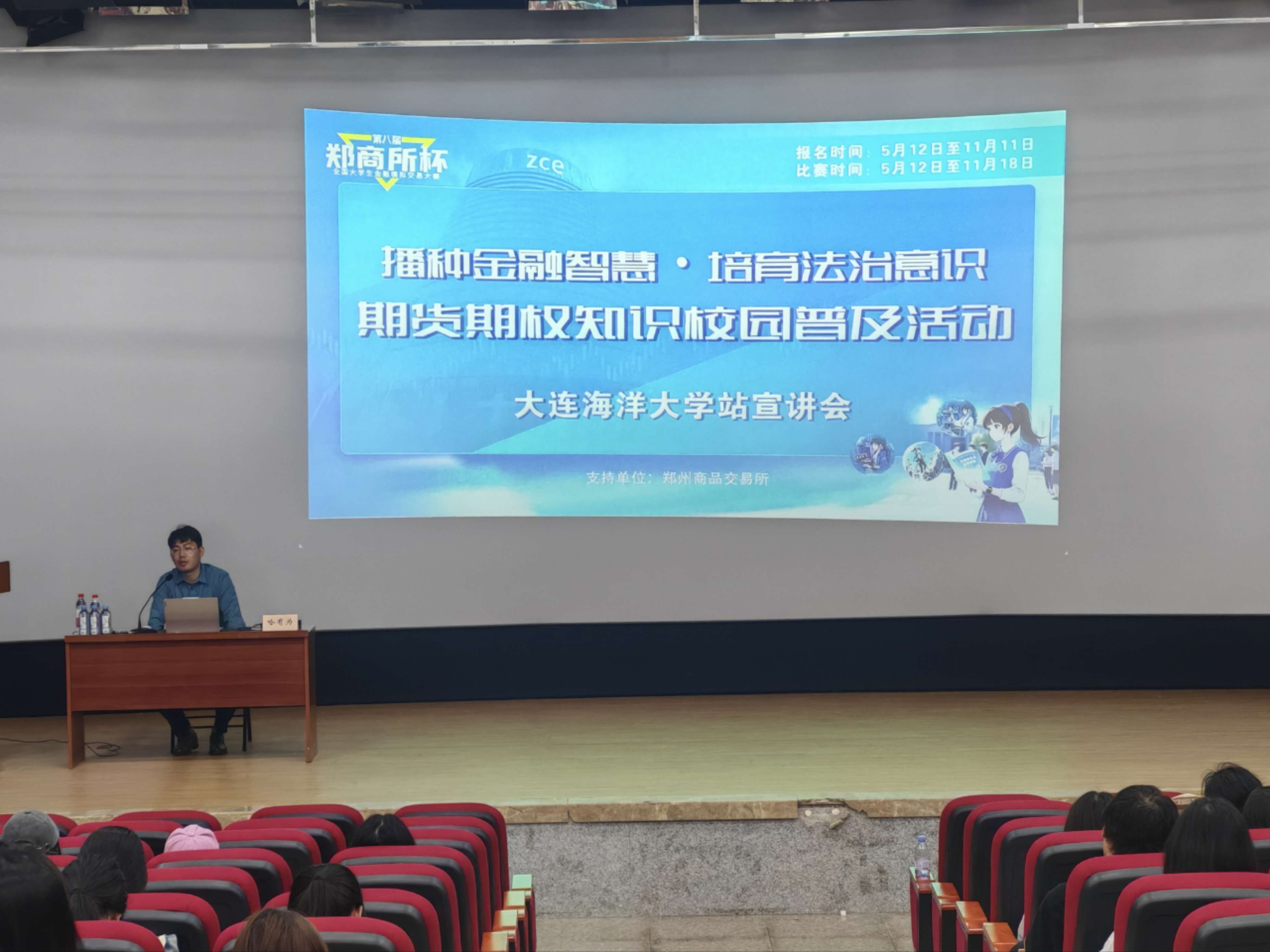 5月28日,51吃瓜网 在大黑石校区阶梯二教室举办大学生创新创业活动系列讲座之第八届“郑商所杯”全国大学生金融模拟交易大赛宣讲会。宣讲会由法律系副主任杨凯旋主持,郑州商品交易所工作人员哈有为主讲,51吃瓜网 各年级学生共200余人参加。