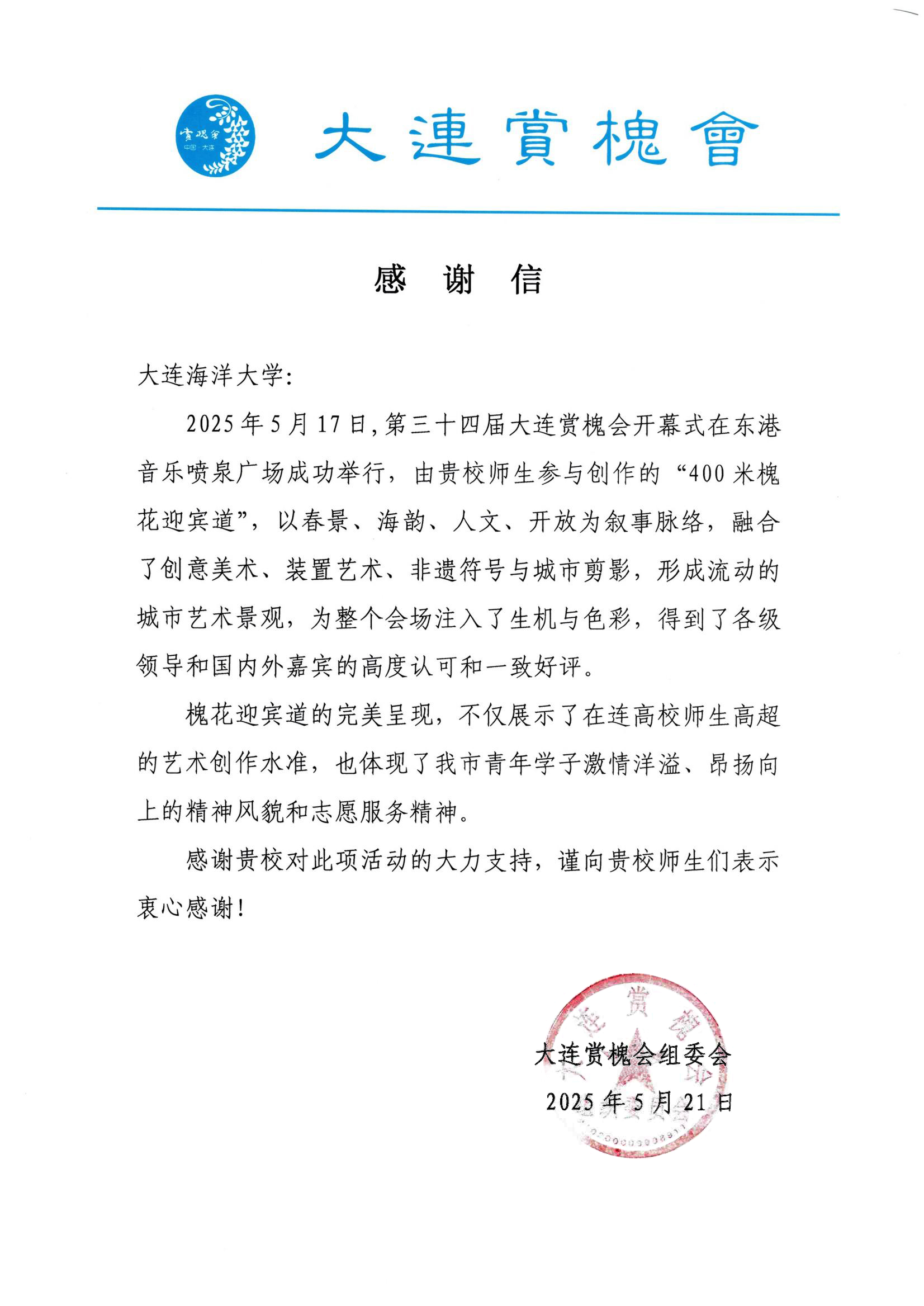 近日,第三十四届大连赏槐会组委会向我校发来感谢信,感谢我校师生参与创作了“400米槐花迎宾道”,展示了高超的艺术创作水准,展现了青年学子激情洋溢、昂扬向上的精神风貌和志愿服务精神。