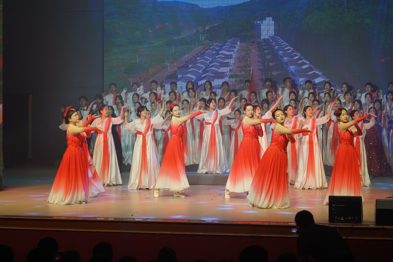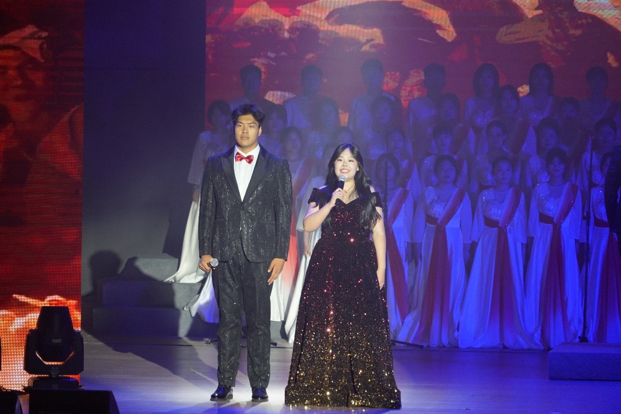 学院合唱队伍将舞台剧、朗诵、舞蹈以及视频等多元形式融入合唱之中。演唱《保卫黄河》时,铿锵激昂的歌声如惊涛拍岸,生动再现了中华民族不屈的抗争精神;演绎《国家》时,婉转悠扬的旋律搭配优美舞姿,传递出对祖国的无限热爱。