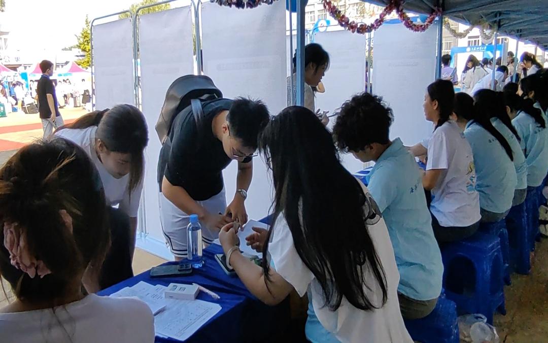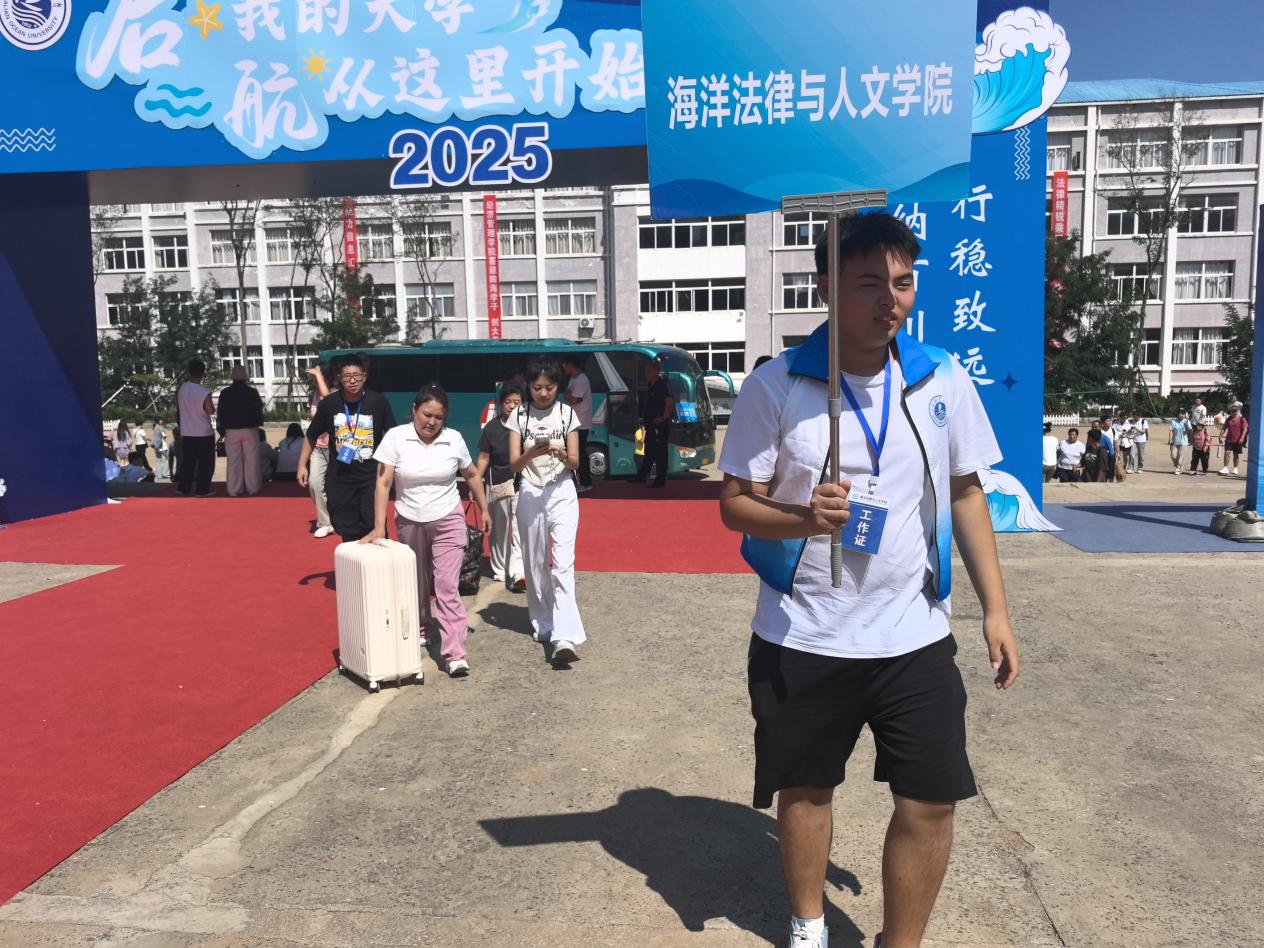 大黑石迎新现场,联络组、接待组、服务组、保障组、宣传组等各组志愿者同学们分工有序、配合默契,热情周到地引领新生及家长顺利完成报到流程。