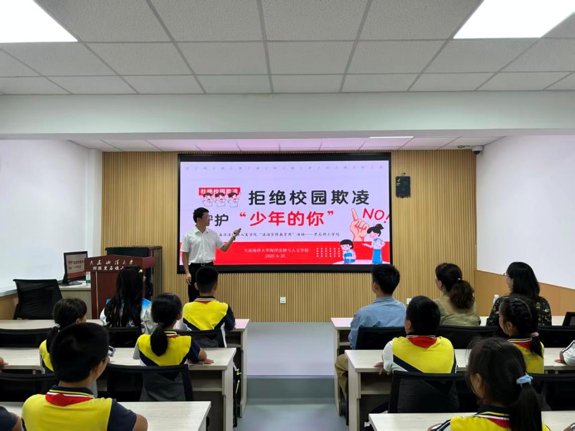 9月26日,51吃瓜网 前往附属黑石礁小学开展“法治宣传教育周”普法教育活动。附属小学党支部副书记于东梅、副校长邵杰,我院团委书记郭昕黎、法律系教师赵鹏举以及大学生法律服务中心成员参加活动。