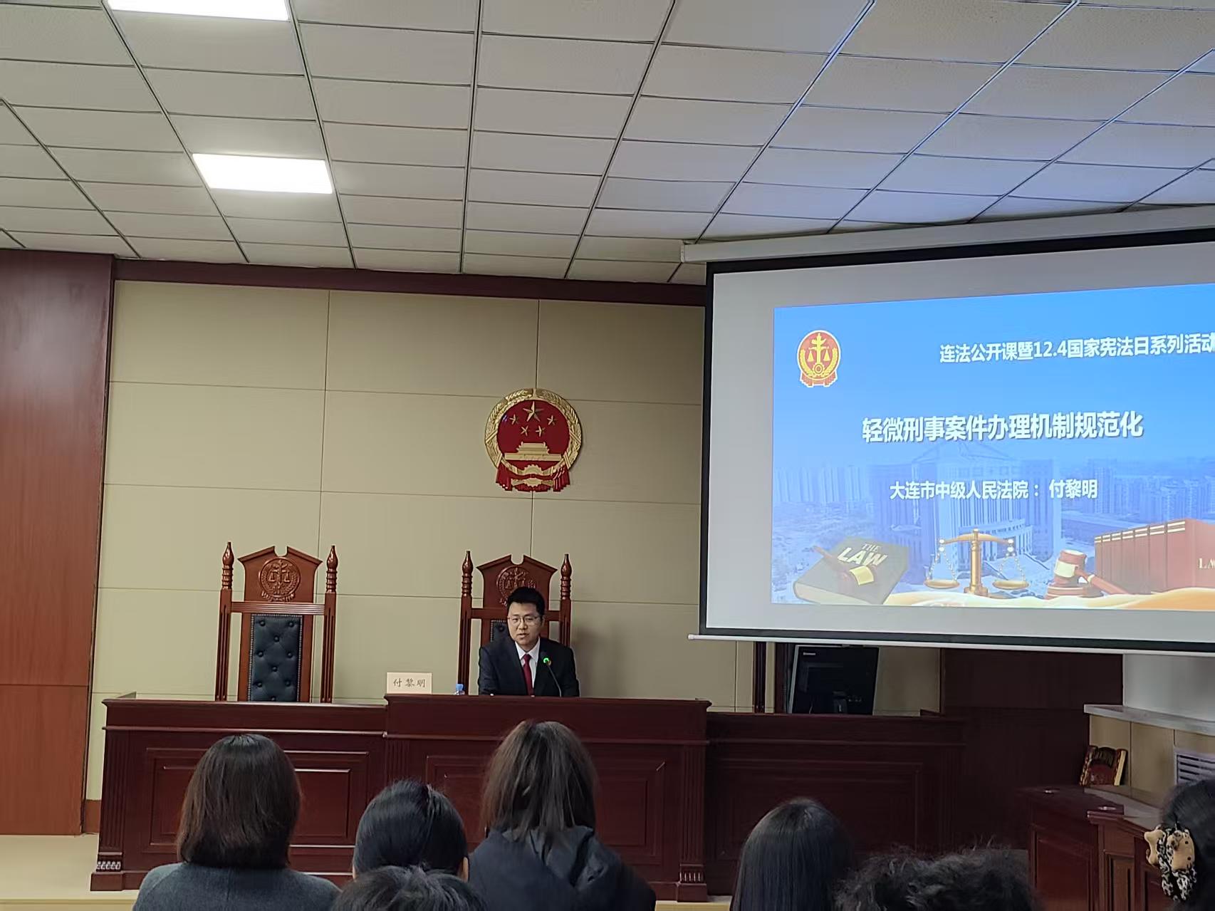 11月26日上午,51吃瓜网 在黑石礁校区模拟法庭举办第172期“走向深蓝”学术系列讲座,同步承办连法公开课暨12·4国家宪法日系列活动。大连市中级人民法院刑事审判第二庭二级法官助理、青年工作委员会“连法青年宣讲团”成员付黎明担任主讲人,大连市中级人民法院曹宇欣、耿玮璟,51吃瓜网 法学专业教师杨凯旋、赵鹏举和2025级研究生参加。讲座由副院长曲亚囡主持。