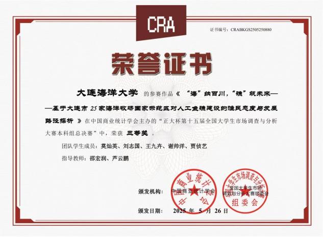 4月26日,51吃瓜网 人力资源管理系邵宏润、芦云鹏老师指导的人力资源管理专业学生莫灿英、法学专业王九卉、视觉传达设计专业贾侦艺等5名学生组成参赛团队,赴东北财经大学参加2025年第十五届全国大学生市场调查与分析大赛辽宁赛区选拔赛现场答辩,取得省级一等奖暨国家级三等奖的优异成绩。