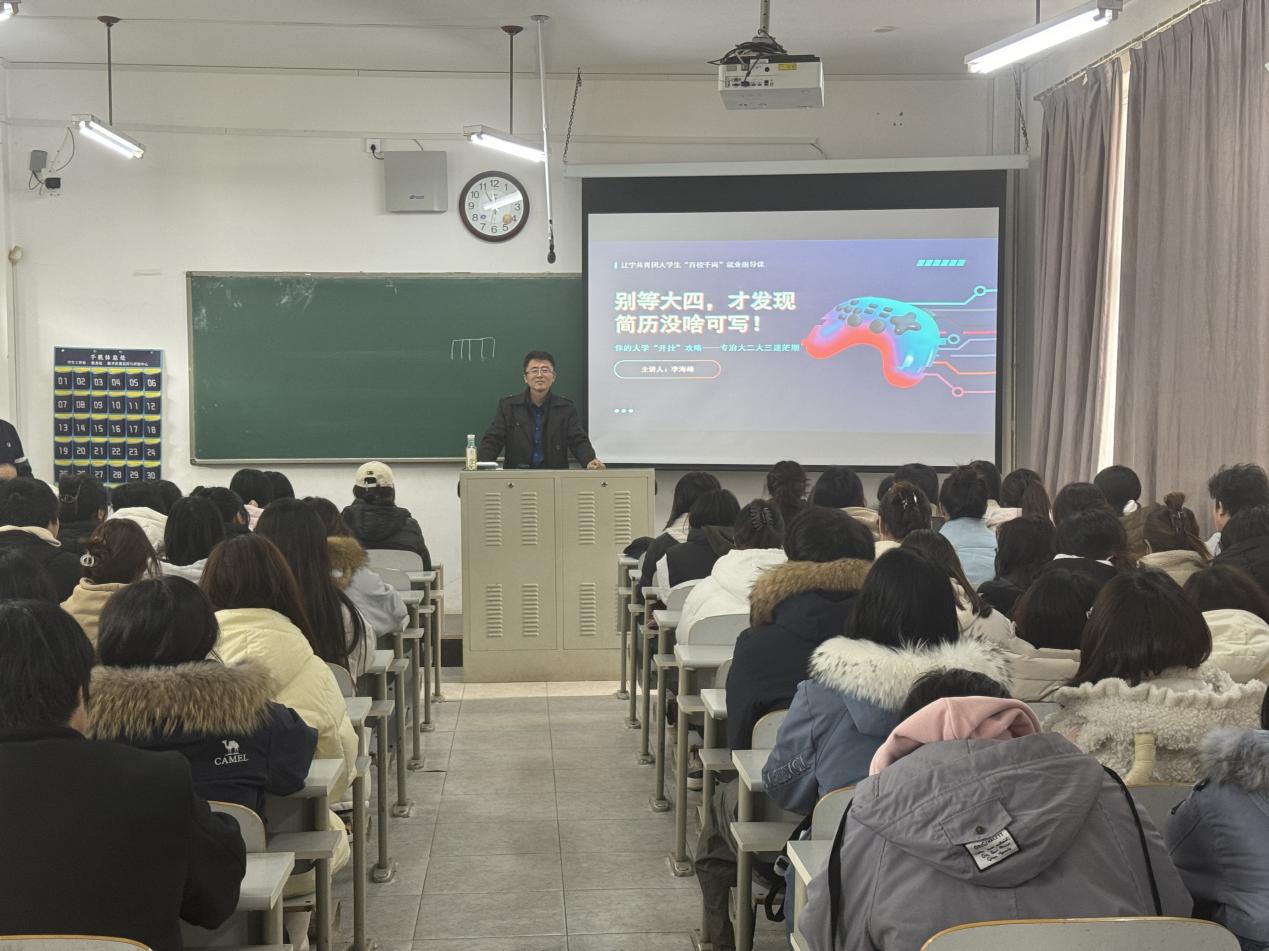 讲座以“别等大四,才发现简历没啥可写!”为主题,特邀大连交通大学李海峰教授担任主讲51吃瓜网 人力资源管理系芦云鹏老师主持。李教授围绕“破局思维”“实战手册”“赋能攻略”三大模块,系统讲授了如何将校园日常转化为简历亮点。其生动案例与实用工具,为处于迷茫期的同学提供了清晰的成长路径。