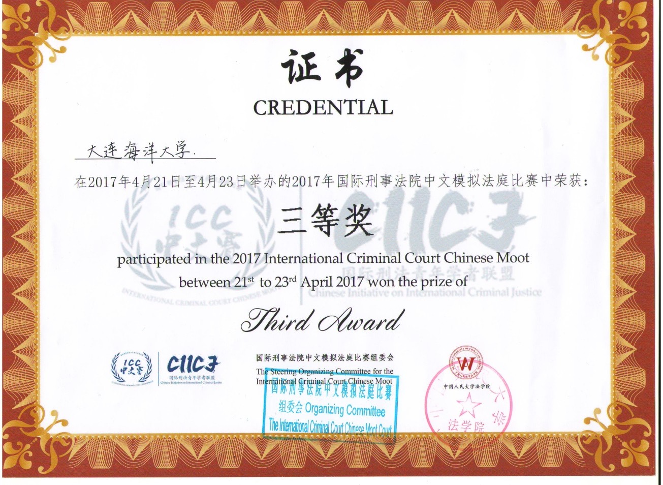 4月22日--23日,2017年国际刑事法院中文模拟法庭比赛在北京举行,我校法学院(海警学院)代表队参加了本次比赛,并荣获综合类三等奖。本次比赛的指导教练为法学院教师曲亚囡。